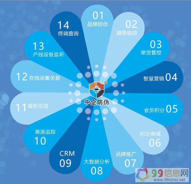 中企防伪在北京设立软件项目研发中心,由研发团队自主开发完成的中企云码平台已为上千家企业所使用,中企云码综合管理平台是利用可变二维码技术、大数据、物联网、互联网等技术,以数字码、二维码、9~9~x~i~n~x~i~n~e~tRFID标签等为载体,为客户提供品牌防伪、溯源追踪、防窜货管控、大数据分析、数字营销等覆盖产品全生命周期的综合管理平台。 99xinxi.net原文www.99xinxi.net